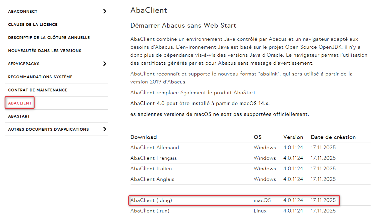 Sélectionner le fichier AbaClient à installer sur le poste de travail en cliquant sur le lien correspondant :